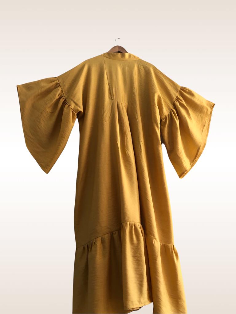 Ürünün kolları ve etek ucunda yapılan katlar, kumaşın hafifliği ve dökümü ile buluşunca, elbise üzerinizde uçuşturacaktır.