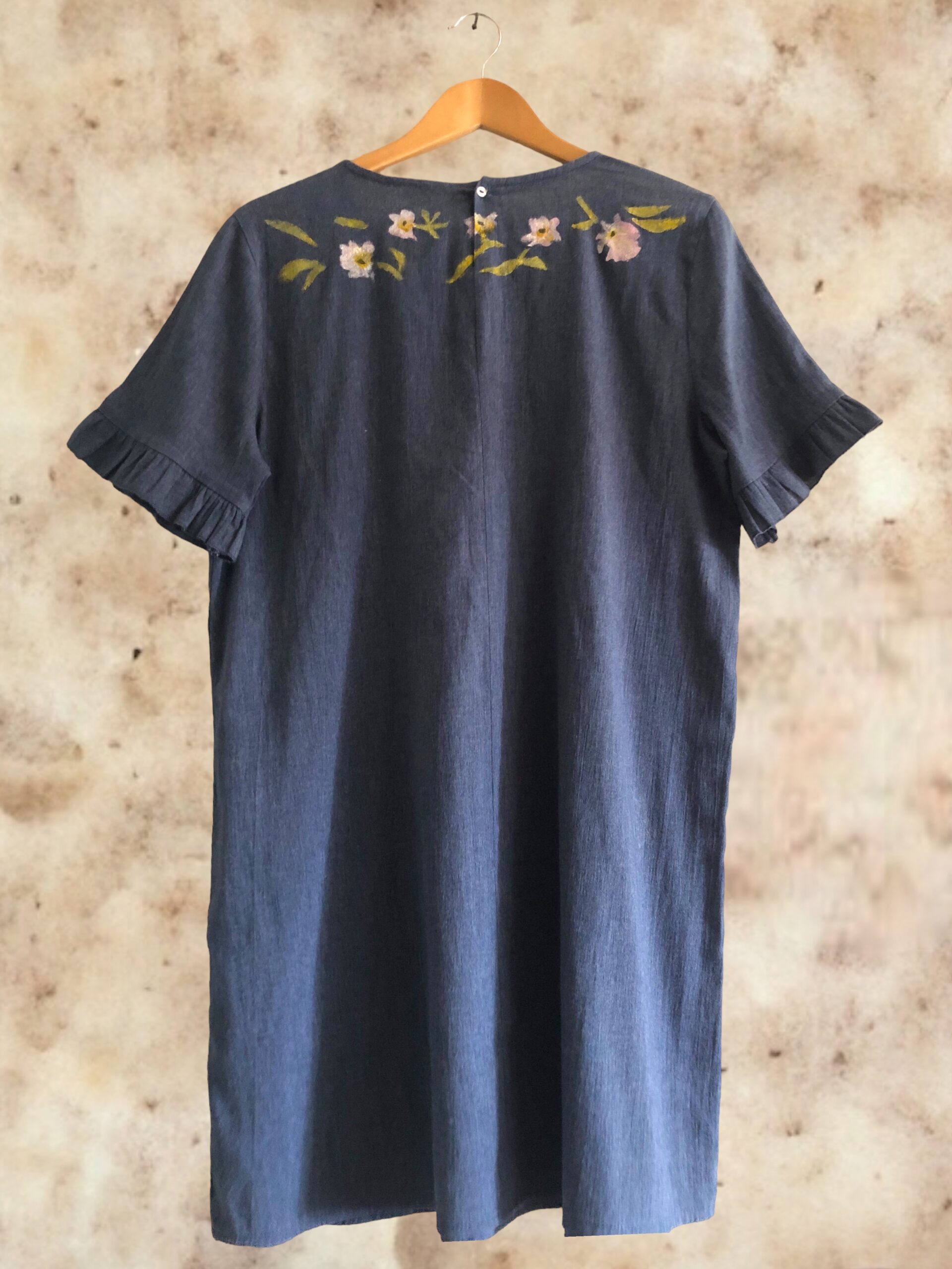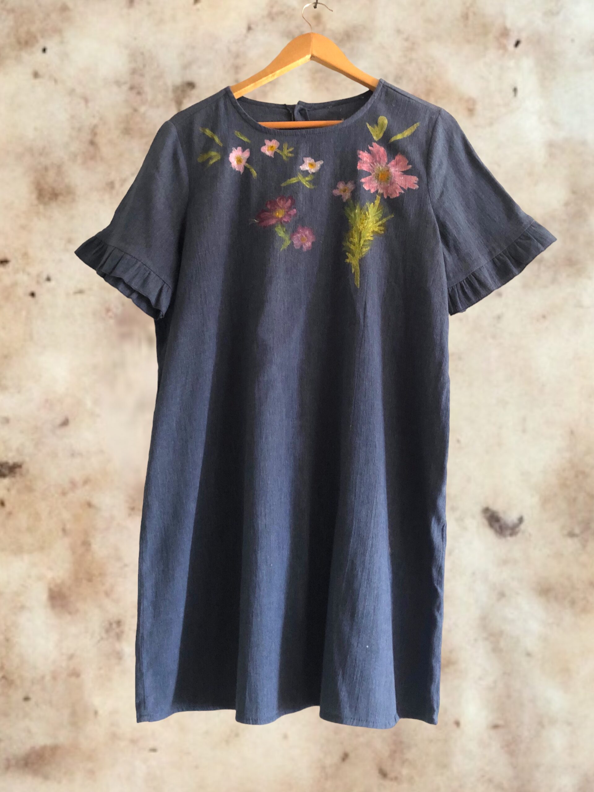 GOTS® ve OEKO-TEX®100 sertifikalı ekolojik Atölye1İstanbul boyaları ile çicek desenleri el baskı tekniği uygulaması yapılmıştır Tek adet olarak koleksiyonumuzda yer almaktadır.
