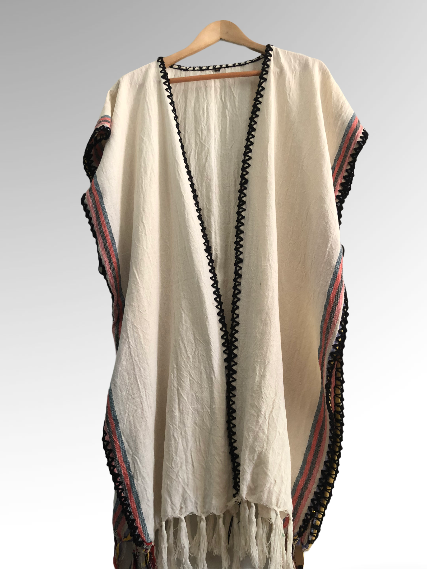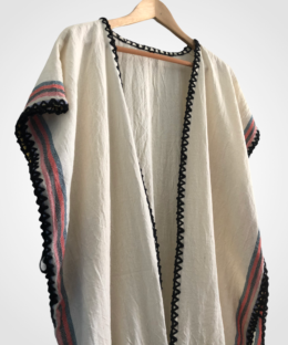 Bu ürünün kumaşı, geleneksel kara tezgahlarda(sürdürülebilir moda),10’lu tarakta, pamuk ipliklerle dokunmuştur. 1 cm dokumada 9 ilmek bulunmaktadır. Önden açık olan modelin kenarları tığ işiyle tamamlanmıştır. Püsküller %100 el yapımıdır. Aynı dokumadan kuşağı bulunmaktadır.