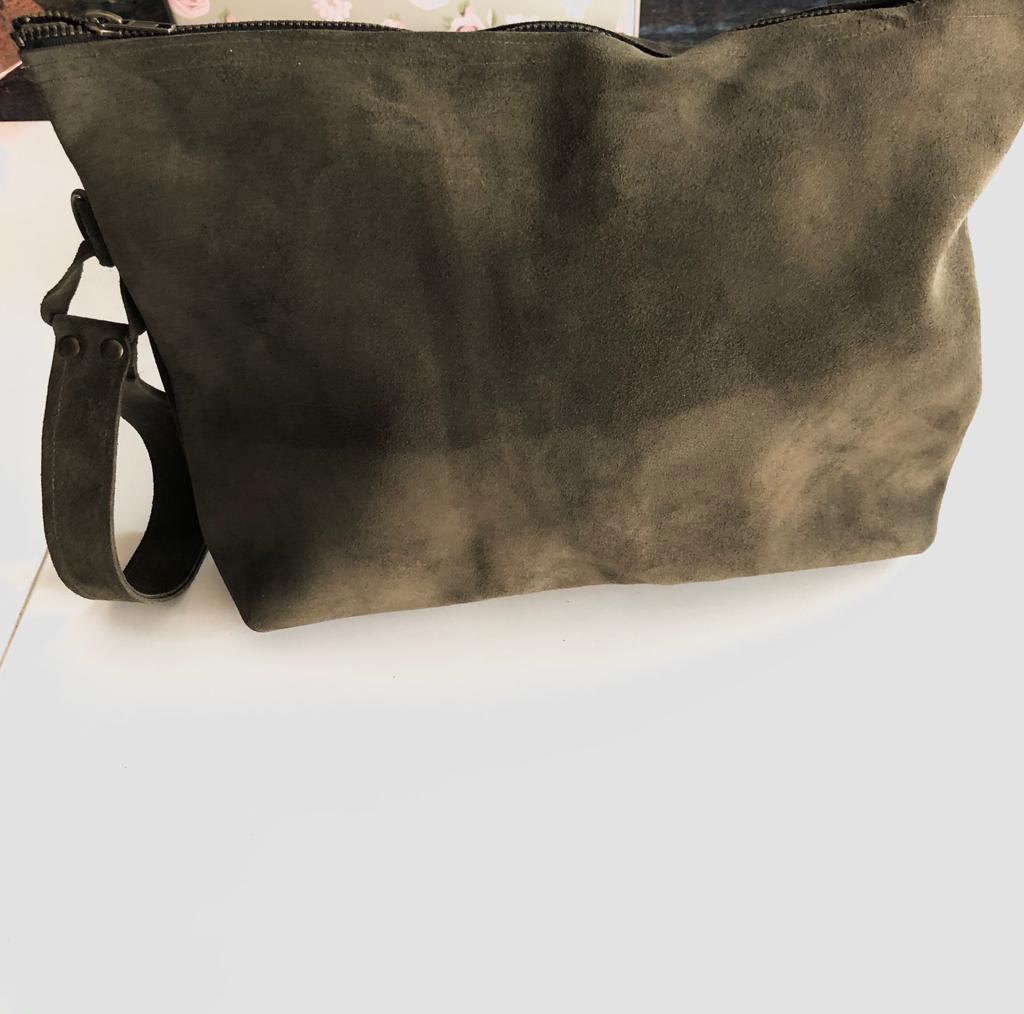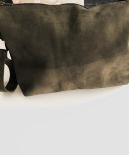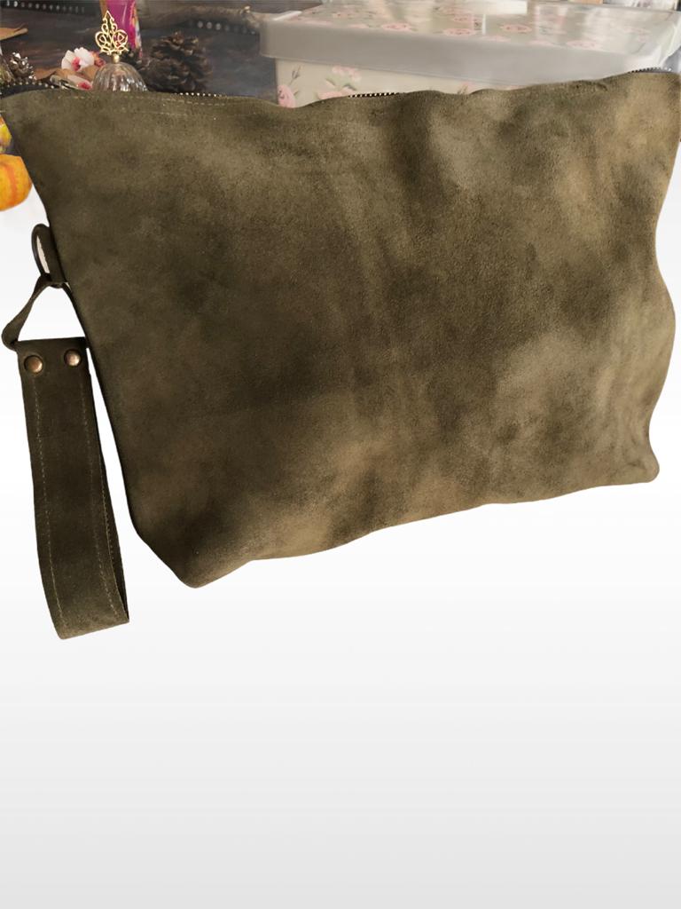 Haki süet clutch çanta. Bilekte tutma sapı mevcuttur.